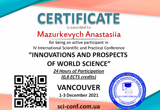 Анастасія Мазуркевич взяла участь у IV міжнародній науково-практичній конференції «Інновації та перспективи світової науки», яка проходила в місті Ванкувер, Канада 1-3 грудня цього року.