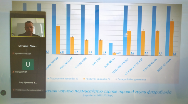 Від Національного університету біоресурсів і природокористування України була зроблена доповідь аспіранта спеціальності 202 Захист і карантин рослин кафедри фітопатології Дениса Мирошниченка на тему «Стійкість сортів троянд до чорної плямистості». Доповідачем розкрито особливості діагностики хвороби, викликаної грибом Diplocarpon rosae F.A. Wolf. (Marssonina rosae (Lib.) Died.) та закцентовано увагу на уражуваність сортів троянд двох садових груп – чайно-гібридних і флорибунда.