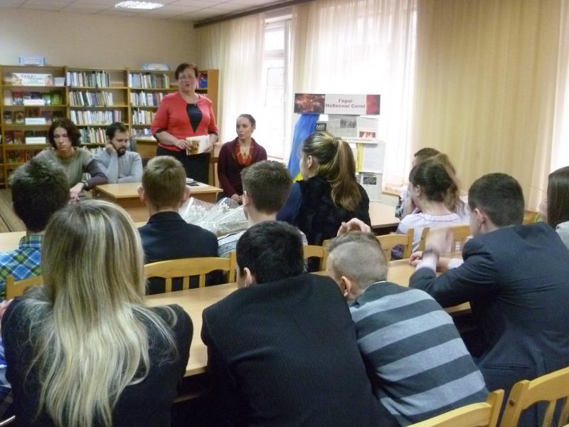 Ось і 22 лютого у бібліотеці імені О. Матросова Оксана Яблонська зустрілася із восьмикласниками гімназії № 154. Цього вечора учасники Революції Гідності – письменники та волонтери Максим Меркулов, Валентина Захабура, Олена Максименко та Оксана Яблонська разом із учнями гімназії пригадували перебіг подій на Майдані та читали свої вірші, присвячені революційним подіям.