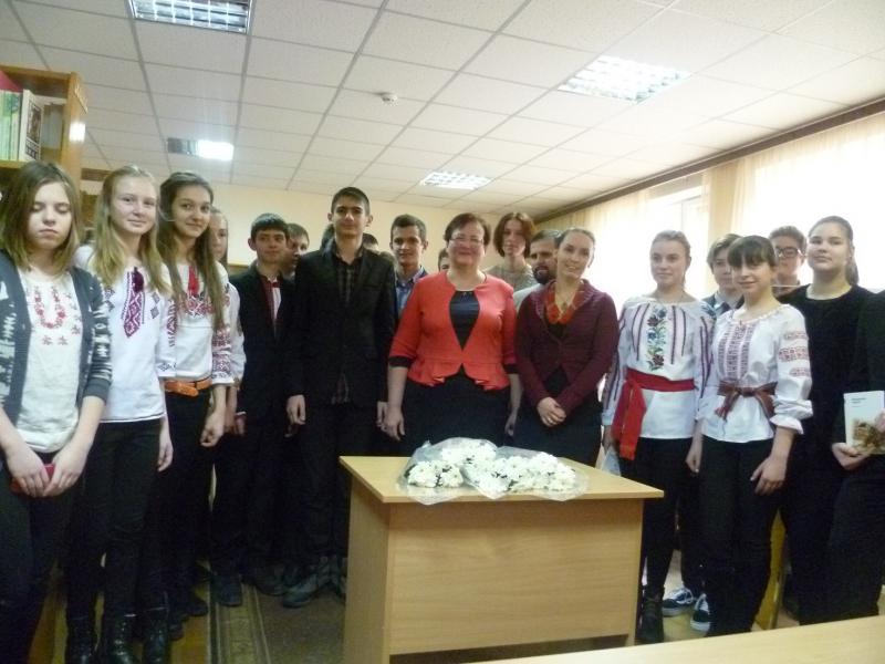 Оксана Яблонська розповіла про укладений нею збірник «Викрадення Європи», в який увійшла революційна поезія Майдану, та перевела розмову на сьогодення і розказала про особливості навчання в Національному університеті біоресурсів і природокористування, зокрема на факультеті ветеринарної медицини, чим викликала значний інтерес в учнів та вчителів 154 гімназії Шевченківського району міста Києва.