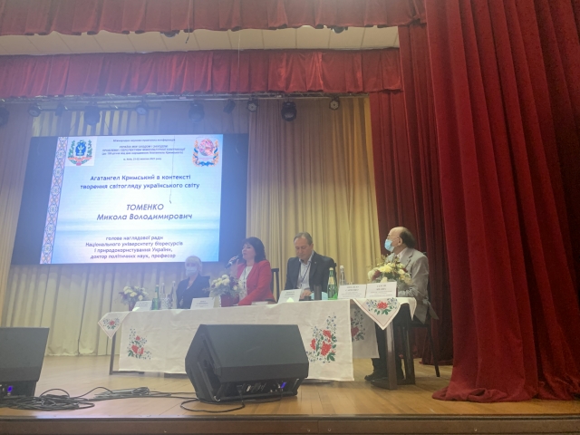 Власне наукову частину конференції відкрив доктор політичних наук, голова наглядової ради НУБіП України Микола Томенко. У своїй доповіді «Агатангел Кримський в контексті творення світогляду українського світу» Микола Володимирович наголосив, що необхідно пам’ятати великих українців, які забезпечували можливості існування сучасної України. Слід цінувати по-перше, внесок Кримського у творення Української Академії наук, по-друге, його філологічну спадщину, яка актуальна в ХХІ столітті: підручниками А. Кримського користуються сьогодні в Східних країнах. По-третє, Кримський, опонуючи концепцію Погодіна-Соболевського, доводив ґенезу української мови з ХІ столітті, тим самим наполягаючи, що українці – це автохтонний етнос, що жив на цій землі з давніх-давен.