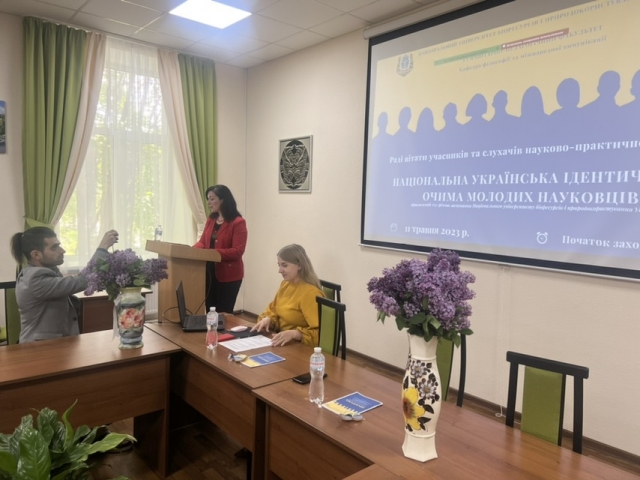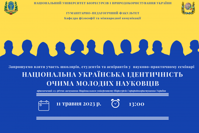 Враховуючи важливість та актуальність даної проблеми, кафедра філософії та міжнародної комунікації гуманітарно-педагогічного факультету НУБІП України провела науково-практичний семінар «Національна українська ідентичність очима молодих науковців», який був присвячений 125-річниці НУБіП України. Семінар був організовиний з метою формування національно-культурної самоідентичності молоді на основі цінностей україноцентризму. Подібні заходи - це спільна платформа обговорення глобальних соціо-культурних перетворень, що відбуваються в наш час, долучення молодих науковців (аспірантів, студентів та учнів) до публічних виступів, дебатів та обговорень викликів сучасності, які постають перед соціумом в сьогоденні.