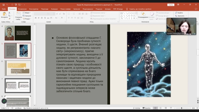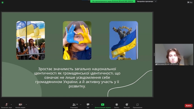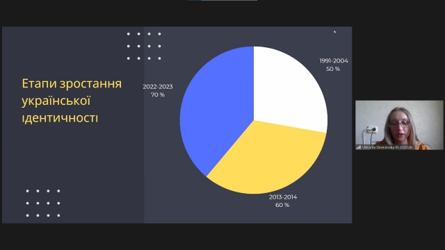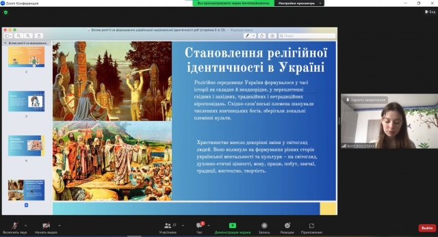 Доповідь на тему «Національна ідентичність і релігія» була представлена Литвинчук Аллою. Студентка гуманітарно-педагогічного факультету Деревінська Вікторія, презентувала тему «Вплив повномасштабного вторгнення Росії на територію України на українську ідентичність та проблему мовного аспекту».