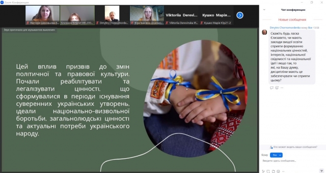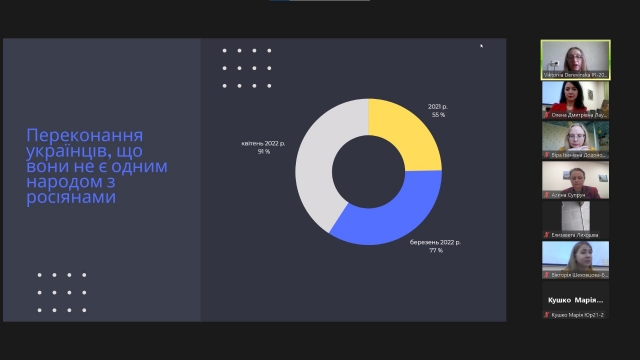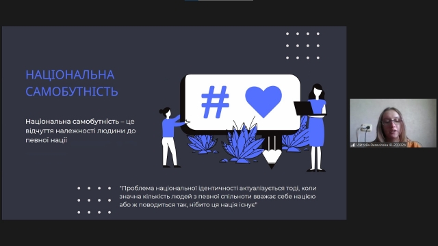Роботу науково-практичного семінару, який відбувся в очно-дистанційному форматі, розпочала ініціатор та модератор заходу, асистент кафедри філософії та міжнародної комунікації Вікторія Шеховцова-Бурянова, яка відзначила, що національна ідентичність — усвідомлена приналежність до національної спільноти на основі стійкого емоційного зв’язку, що виникає у результаті сформованої системи уявлень щодо традицій, культури, мови, політики, а також прийняття групових норм і цінностей. Усвідомлення та осмислення власної ідентичності є одним з найважливіших мотиваційних чинників поведінки. Національна ідентичність не є природженою рисою. Вона виникає з набутого усвідомлення спільності культури, історії, мови з певною групою людей.