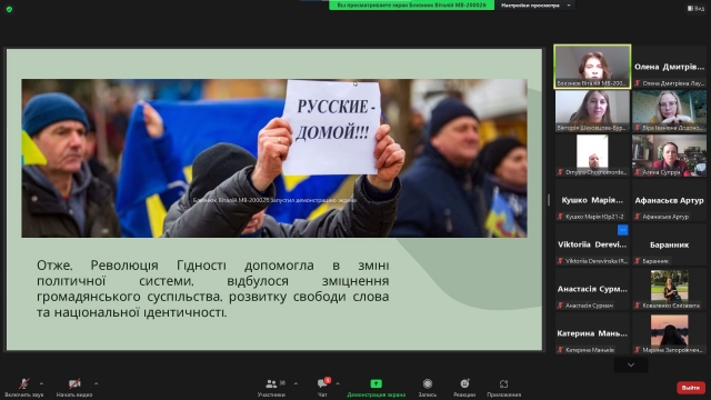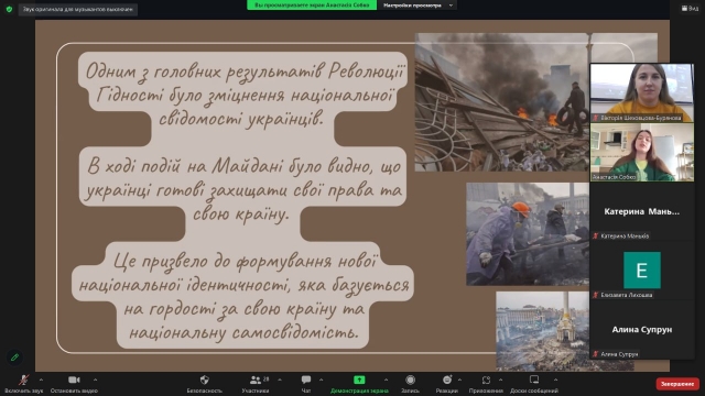 Практичну частину семінару розпочала Собко Анастасія, студентка гуманітарно-педагогічного факультету, НУБІП України, яка виступила з темою «Влив Революції Гідності на національну ідентичність українців».