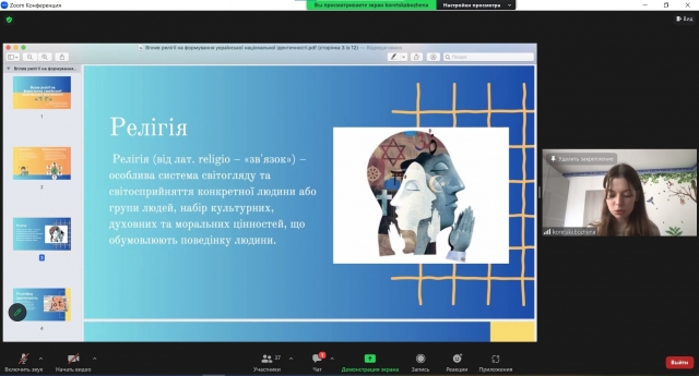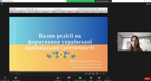 Цікаву та актуальну доповідь на тему «Вплив релігії на формування української національної ідентичності» презентувала Корецька Божена, учениця 8 класу, Луцького ліцею №21 імені Михайла Кравчука, яка розглянула як особливості релігійної ідентичності українців.