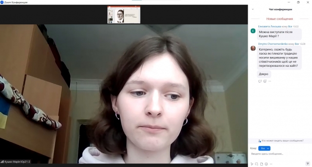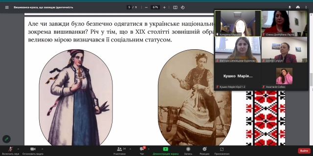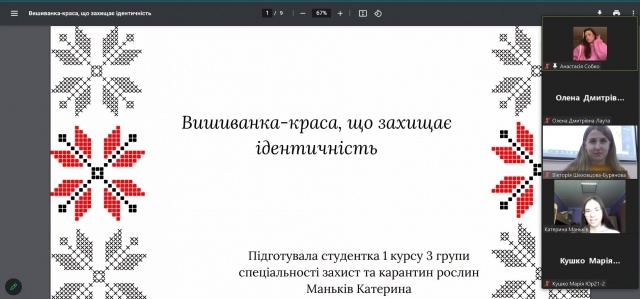 У своїй доповіді «Вишиванка-краса, що захищає ідентичність» студентка факультету захисту рослин, біотехнологій та екології Маньків Катерина розглянула важливість вишиванки як прояв української ідентичності.