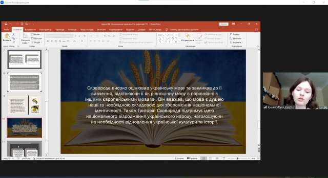 Кушко Марія, студентка юридичного факультету презентував доповідь на тему «Вплив Григорія Сковороди на національну ідентичність українців».