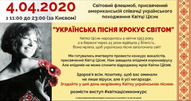 4 квітня стартував світовий флеш-моб, присвячений американській співачці українського походження Квітці Цісик. Це - четвертий Міжнародний фестиваль вокального мистецтва, який цьогоріч відбудеться он-лайн.