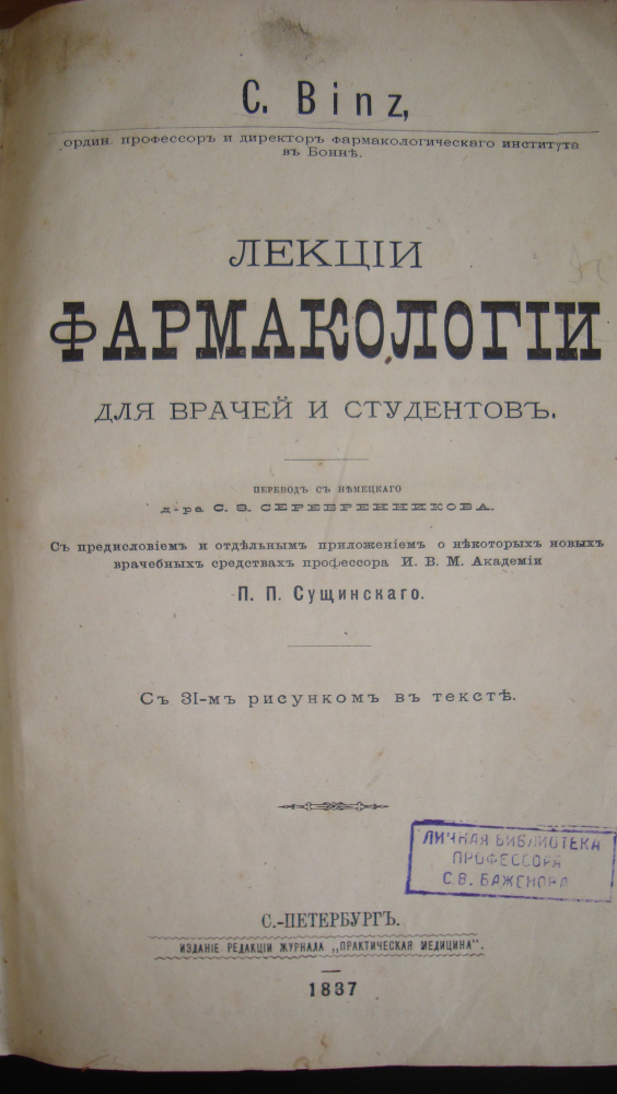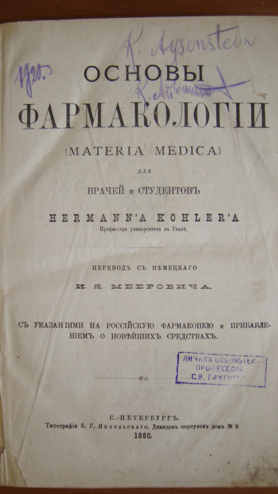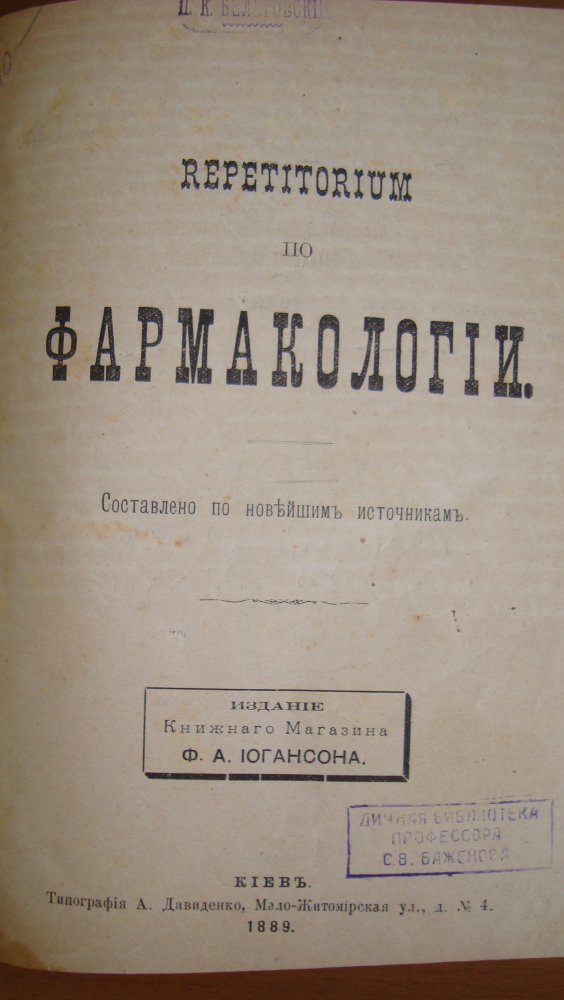 Римляни говорили "Habent sua fata libelli", що означає "у кожної книги своя доля", а доля багатьох книжок особистої бібліотеки професора Баженова С.В. привела їх до бібліотеки кафедри фармакології та токсикології. У свій час вчений зробив такий подарунок. Зараз вони є раритетами нашого унікального фонду.