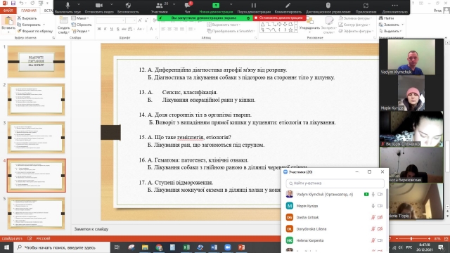20 грудня 2021 року згідно графіка екзаменів, який затверджений начальником навчальної частини НУБіП України, студенти 6 групи 5 курсу повного терміну навчання факультету ветеринарної медицини успішно склали іспит з дисципліни «Загальна і спеціальна хірургія» дистанційно з використанням ЕНК на базі eLearn та відеоконференції Zoom.