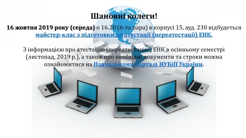 Увага! Атестація (переатестація) ЕНК, осінь 2019 року Більш детальна інформація за посиланнями у прикріпленому файлі 11 жовтня 2019 року 03:00 - 03:00