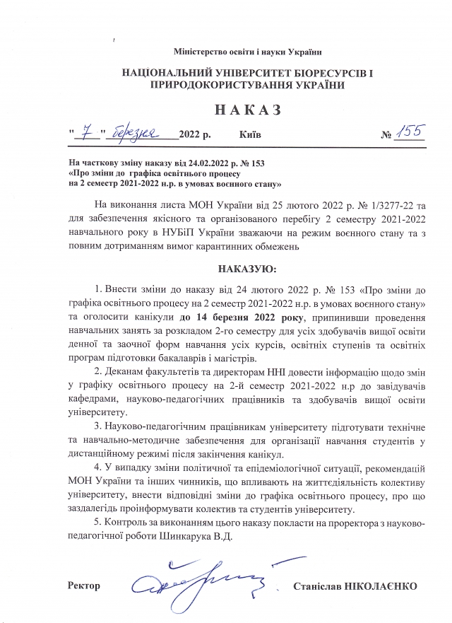 У зв'язку з військовою агресією проти України, запровадженням воєнного стану на всій території держави у Національному університеті біоресурсів і природокористування України оголошено канікули до 14 березня 2022 року.