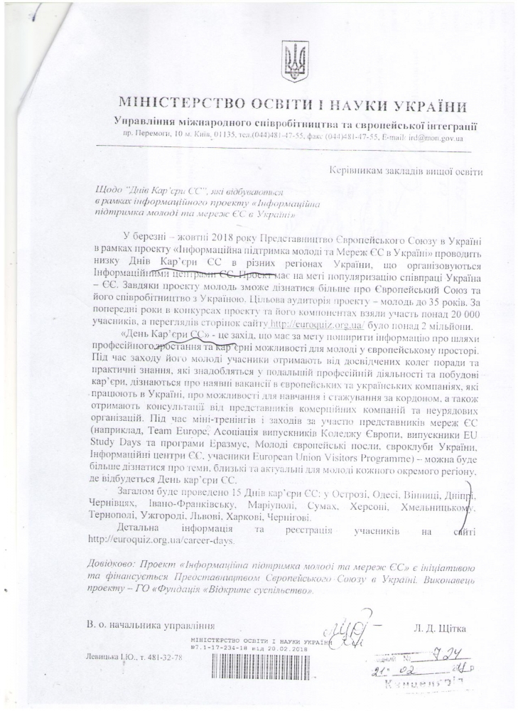 Увага студентам! Відбудуться Дні кар'єри в ЄС та інші цікаві міроприємства! Сергій Деркач 28 лютого 2018 року 02:00 - 02:00