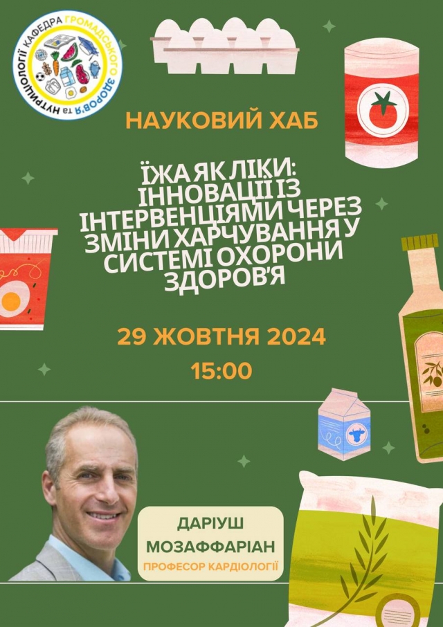 29 жовтня о 15.00 в онлайн-режимі відбудеться засідання наукового хабу з обговоренням лекції радника президента Дж. Байдена з програм харчування, найбільш цитованого науковця з проблем харчування Даріуша Мозаффаріана.