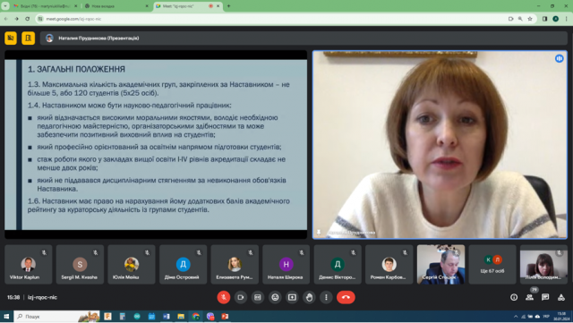 Заступник директора Лілія Мартинюк ознайомила присутніх з додатковими обов’язками наставників в умовах воєнного стану та змістом Програми виховання студентів у НУБіП України «Громадянин, патріот, фахівець».