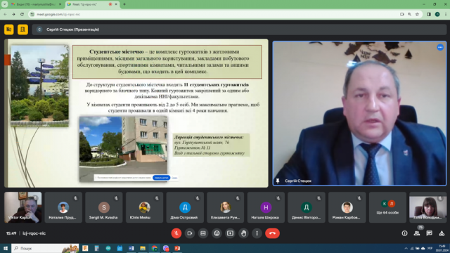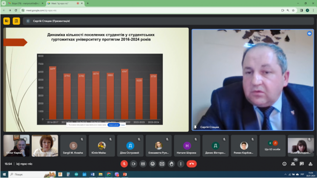 Сергій Васильович проінформував всіх присутніх про динаміку кількості поселених студентів у гуртожитки, рівень їхньої оплати та про створені умови для комфортного проживання. Окремо спікер зупинився на аналізі найбільш поширених порушень правил проживання у гуртожитках, наявність обладнаних місць в укриттях, функціонуванні центру надання побутових послуг і ін.