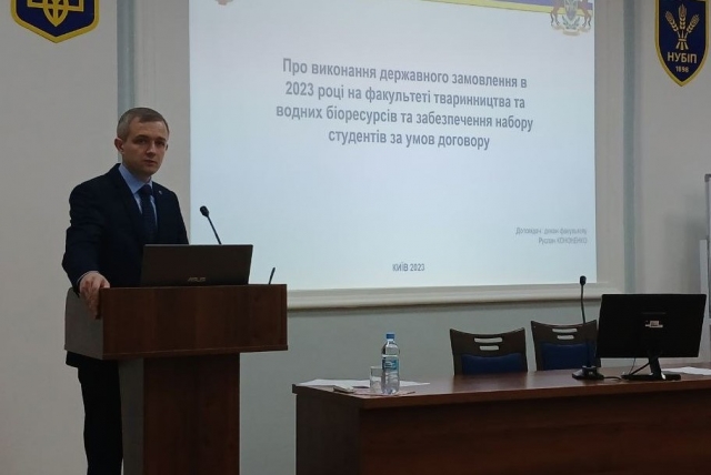 Далі були розглянуті питання порядку денного. Перше питання про виконання державного замовлення в 2023 році на факультеті тваринництва та водних біоресурсів та забезпечення набору студентів за умов договору доповів декан факультету Руслан Кононенко. Він наголосив на складних умовах вступу абітурієнтів та проблемах формування контингенту студентів, а також звернув увагу на роль профорієнтаційної роботи, не зважаючи на хороші результати вступної кампанії.