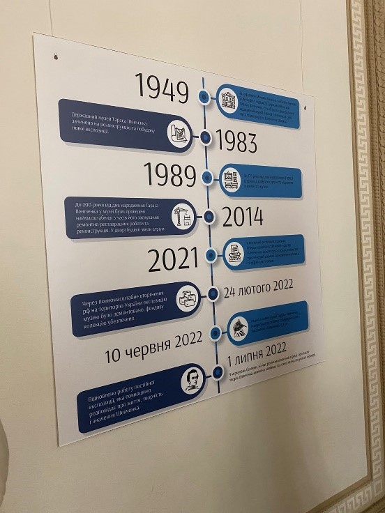 Національний музей Тараса Шевченка – літературно-художній музей у Києві, присвячений життю та творчості українського поета й художника, філософа, публічного інтелектуала – Тараса Шевченка. Ось найголовніші віхи історії музею, які відмічають студенти. У 1926 в Харкові було засновано Інститут Тараса Шевченка (нині його правонаступник – Інститут літератури імені Т. Шевченка НАН України). Зусиллями працівників Інституту було зібрано рукописи поета, малярські та графічні твори художника. Цим було закладено основу для наукових досліджень спадщини митця, видання його творів та створення у Харкові Галереї картин Шевченка. Її заснували при Інституті Тараса Шевченка в грудні 1932, а офіційно відкрили – 9 березня 1934, на 120-річчя поета. Галерея картин Шевченка стала першою музейною установою, де було зібрано його мистецькі твори, видання та документи: до фондів було передано 107 оригінальних творів Шевченка та частину приписуваних йому робіт, а згодом сюди додано й шевченкіану Чернігівського історичного музею.