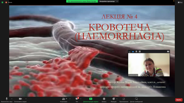 19 вересня 2023 року доцент кафедри хірургії і патофізіології ім. акад. І.О. Поваженка Марія Куліда прочитала відкриту лекцію для студентів 4 курсу скороченого терміну навчання (спеціальність 211 «Ветеринарна медицина», ОC «Магістр») на тему "Кровотеча". Лекція відбулася у дистанційному форматі на платформі Cisco Webex Meetings.