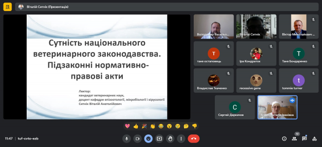 08 вересня 2023 року доцент кафедри епізоотології, мікробіології і вірусології Віталій Ситнік провів відкриту лекцію з дисципліни «Організація ветеринарної справи, національне і міжнародне ветеринарне законодавство» для студентів 5 курсу ОС «Магістр» спеціальності 211 «Ветеринарна медицина» на тему: «Сутність національного ветеринарного законодавства. Підзаконні нормативно-правові акти». Лекція відбулася у дистанційному форматі на платформі Zoom Meetings.
