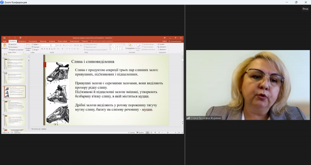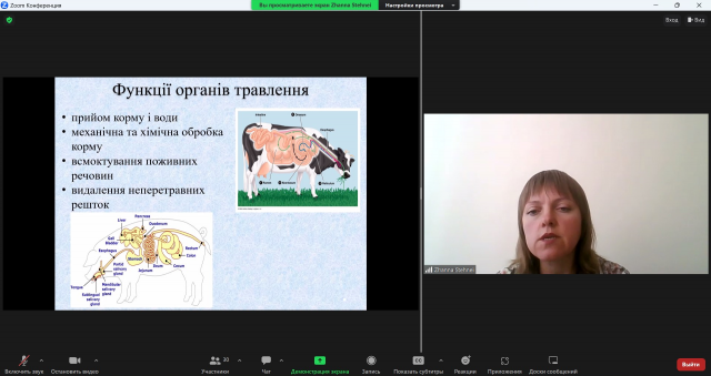 14 вересня 2023 року відбулася відкрита лекція доцента кафедри анатомії, гістології і патоморфології тварин імені академіка В.Г. Касьяненка, кандидата ветеринарних наук Жанни Стегней з дисципліни «Цитологія, гістологія, ембріологія» для студентів 2 курсу ОС «Магістр» спеціальності 211 «Ветеринарна медицина» на тему: «Органи травлення». Лекція відбулась у дистанційному форматі на платформі Zoom Meetings.