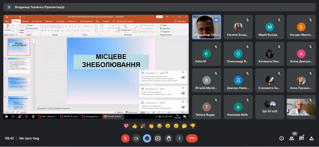 14 вересня 2023 року доцент кафедри хірургії і патофізіології ім. акад. І.О. Поваженка Володимир Ткаченко прочитав відкриту лекцію на тему «Місцеве знеболення» з дисципліни «Оперативна хірургія з основами топографічної анатомії, анастезіологія» для студентів 3 курсу ОС «Магістр» спеціальності 211 «Ветеринарна медицина». Лекція відбулась у дистанційному форматі на платформі Google Meet.