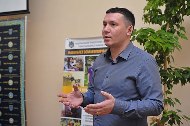 Гість зустрічі, директор компанії «Кайлас А», з радістю відповів на запитання студентів про організаційні моменти проведення зйомки та чим відрізняється знімання за допомогою БПЛА типу «крило» від інших різновидів аерофотознімання місцевості.
