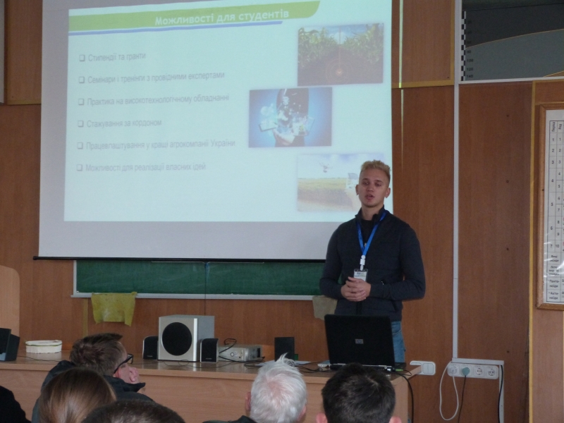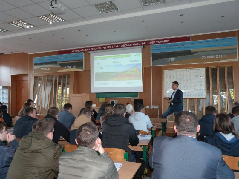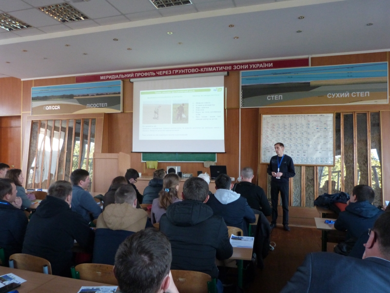 На початку Анатолій Бикін, завідувач кафедри агрохімії та якості продукції рослинництва ім. О. І. Душечкіна, розповів студентам про роль агрохімсервісу у точному землеробстві та його значення у формуванні прибутковості агропідприємств, а також поділився планами кафедри щодо наукової співпраці зі студентами на майбутнє. Олександр Гайдай (спеціаліст «Agrilab») презентував проект «Agristart».