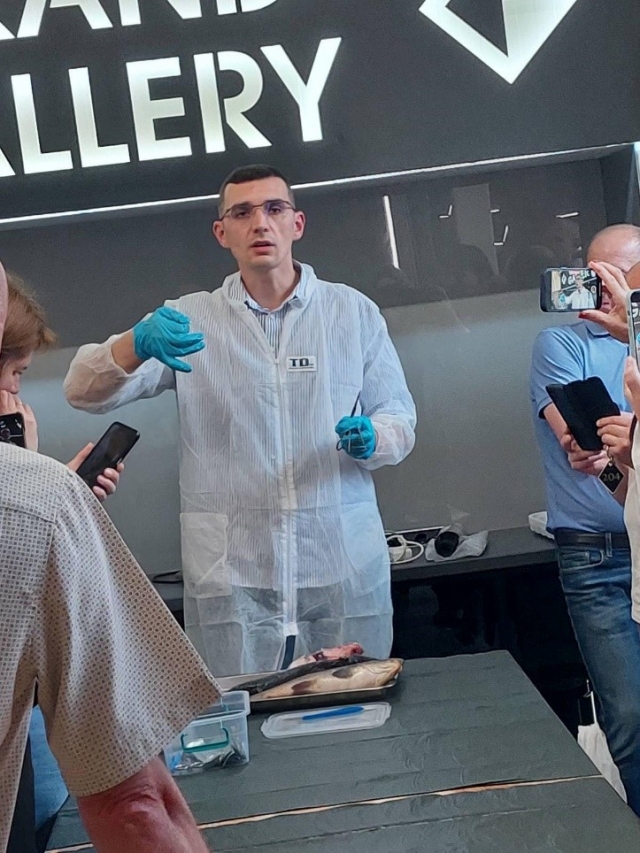 Друга частина семінару передбачала практичну складову – паразитологічний розтин риби, який провів Сергій Леонідович. Він показав майстер-клас із розтину риб, з демонстрацією послідовності дослідження риб та інших гідробіонтів, особливостей препарування та огляду органів і тканин, відбору патологічного матеріалу, а також сучасні діагностичні прийоми, що застосовуються у ветеринарній паразитології.