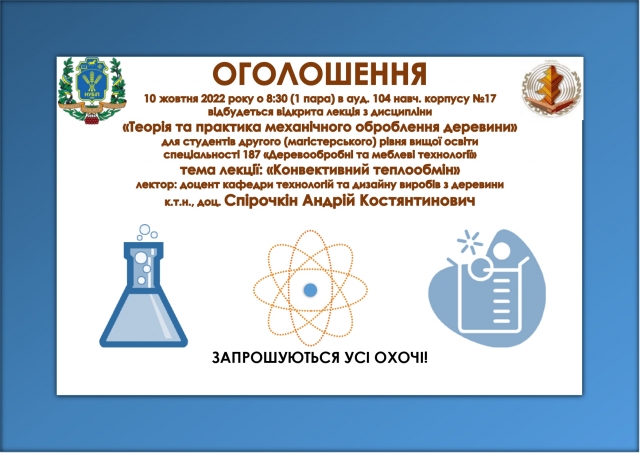 10 жовтня 2022 року о 8:30 (1 пара) в ауд. 104 навч. корпусу №17 відбудеться відкрита лекція з дисципліни «Теорія та практика механічного оброблення деревини» для студентів другого (магістерського) рівня вищої освіти спеціальності 187 «Деревообробні та меблеві технології» тема лекції: «Конвективний теплообмін»