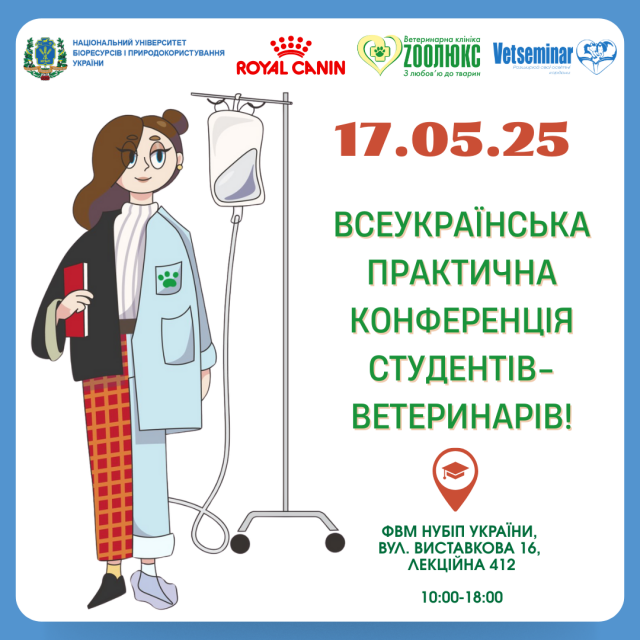 Відбудеться Всеукраїнська практична конференція студентів-ветеринарів Більше інформації тут 16 квітня 2025 року 03:00 - 03:00