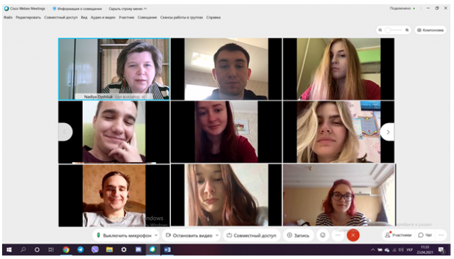 Наставник групи, професор кафедри анатомії, гістології і патоморфології тварин ім. акад. В.Г. Касьяненка Надія Дишлюк, 23 квітня 2021 року на платформі Cisco Webex провела організаційно-виховну годину зі студентами 3 групи 3 курсу факультету ветеринарної медицини. Під час зустрічі були розглянуті поточні питання, пов’язані з Соvid-19, дистанційним навчанням, відвідуванністю занять, проведенням навчальної практики, підготовкою до літньої екзаменаційної сесії, проплатою контрактного навчання тощо.