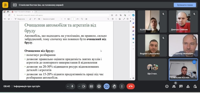10 квітня 2024 року асистент кафедри тракторів і автомобілів Станіслав КОСТЮК провів відкриту лекцію для здобувачів вищої освіти першого (магістерського) рівня спеціальності 275.03 «Транспортні технології на автомобільному транспорті» з дисципліни «Рециклінг автотранспортних засобіві» на тему: «Технології та обладнання утилізації та рециклінгу. Розбирання та очищення АТЗ та агрегатів».