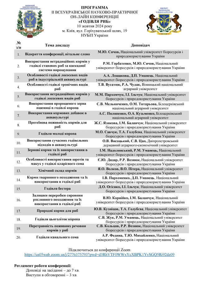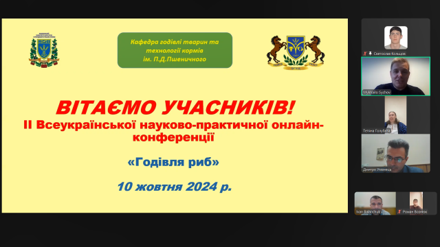 Згідно наказу ректора Університету 10 жовтня 2024 року на базі кафедри годівлі тварин та технології кормів ім. П.Д. Пшеничного відбулась ІІ Всеукраїнська науково-практична онлайн-конференція, яка була присвячена особливостям годівлі риб.