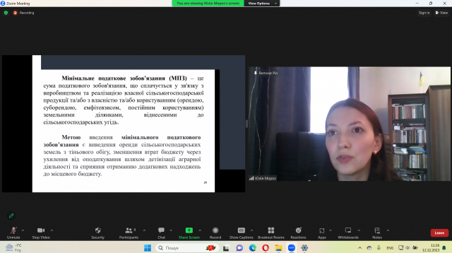 12 грудня 2023 року на фаховому семінарі наукової ради факультету землевпорядкування відбулися публічні презентації наукових результатів здобувачів ступеня доктора філософії, закріплених за кафедрою землевпорядного проєктування. Першою доповідала Мороз Юлія Олександрівна на тему: «Удосконалення платності землекористування на основі ринкової бази оцінки земель» (експерти: професор Новаковська Ірина Олексіївна, професор кафедри земельного кадастру, доктор економічних наук; доцент Кошель Антон Олександрович, доцент кафедри геоінформатики і аерокосмічних досліджень Землі, доктор економічних наук. Науковий керівник: професор Мартин Андрій Геннадійович, завідувач кафедри землевпорядного проектування, доктор економічних наук, член-кореспондент НААН).