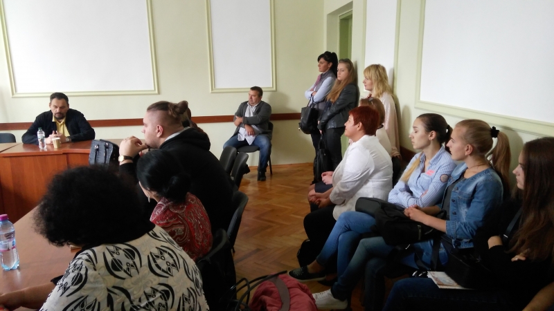 5 вересня колектив кафедри англійської філології організував науково-практичний семінар на тему: "Особливості перекладу з української на англійську мову" за участі відомого українського перекладача-синхроніста Сергія Саржевського. Обговорення теми було дуже цікавим і динамічним. Викладачі разом зі студентами-філологами із зацікавленістю обговорювали нагальні питання сучасного синхронного перекладу. Зустріч відбулася у невимушеній дружній атмосфері. На згадку про неї було зроблено декілька світлин.