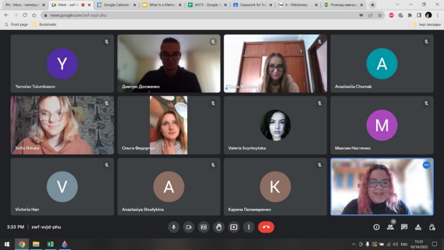 В понеділок 31-го жовтня під уважним керівництвом доцента кафедри англійської філології Олександри Іванівни Чернікової відбулося чергове засіданя студентського наукового гуртка "POP CULTURE IN LANGUAGE AND TRANSLATION”. Було заслухано ряд цікавих доповідей на актуальну тему "Pandemic and War Memes". Студенти, що прийняли участь у заході, продемонстрували високий рівень комунікативної компетентності та плідно попрацювали над вдосконаленням навичків володіння розмовною англійською.