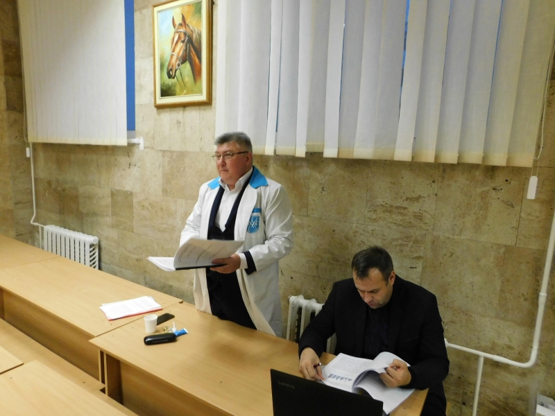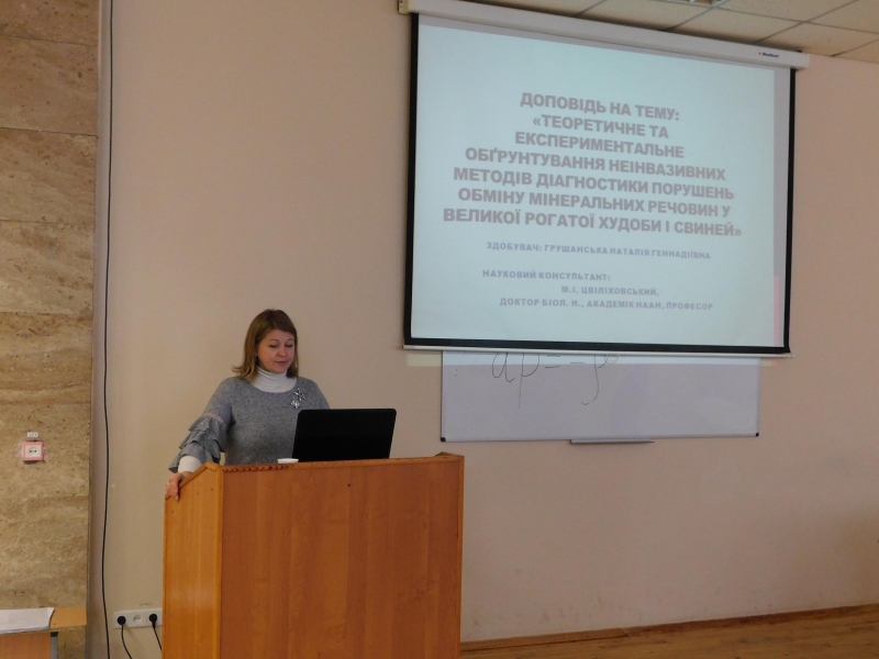 Питання №1 – розгляд дисертаційної роботи Грушанської Наталії Геннадіївни, здобувача кафедри терапії і клінічної діагностики, на тему «теоретичне та експериментальне обґрунтування неінвазивних методів діагностики порушень обміну мінеральних речовин у великої рогатої худоби та свиней», поданої на здобуття ступеня доктора ветеринарних наук за спеціальністю 16.00.01 «Діагностика і терапія тварин». Головував на засіданні професор Засєкін Д. А. (голова ради).