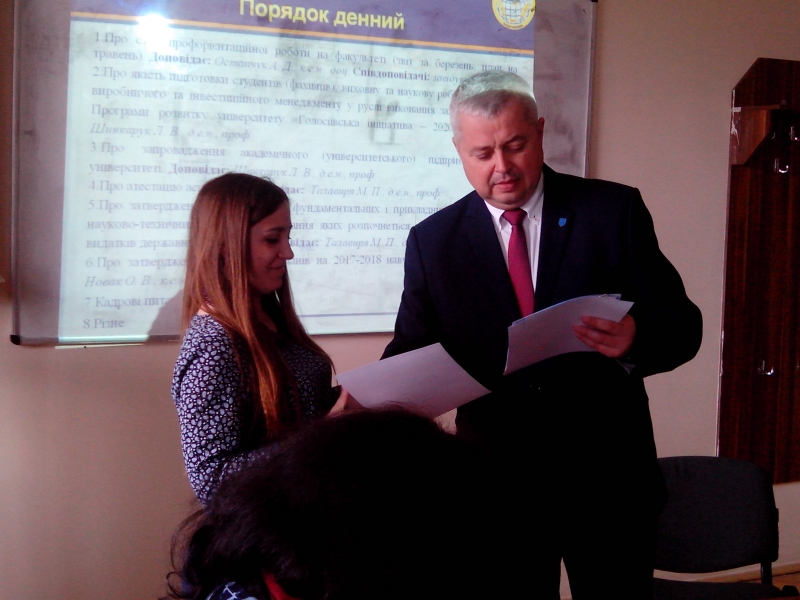 Завідувач кафедри виробничого та інвестиційного менеджменту Лідія Шинкарук проінформувала членів вченої ради про якість підготовки студентів, виховну і наукову роботу на кафедрі виробничого та інвестиційного менеджменту у руслі виконання заходів реалізації Програми розвитку «Голосіївська ініціатива – 2020».