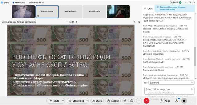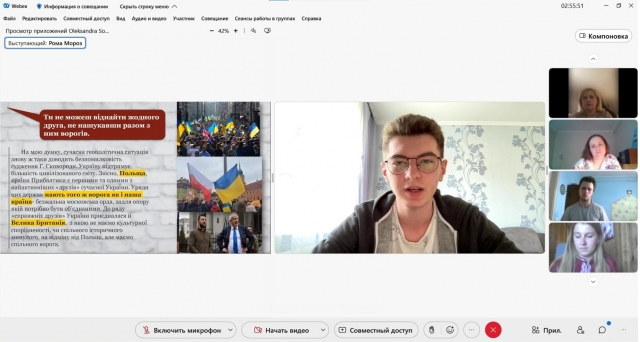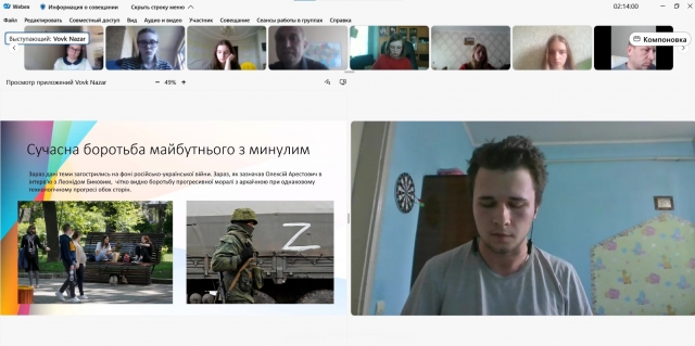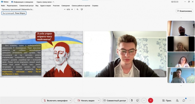 Аспірант Андрій Сорокін свій виступ присвятив проблематиці зрадництва у художньо-публіцистичному творі Б. Олійника «Два роки у Кремлі». Яніна Алєєва зосередила увагу на темі історичної пам’яті та постаті Григорія Сковороди, без якої неможлива самоідентифікація українців.