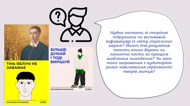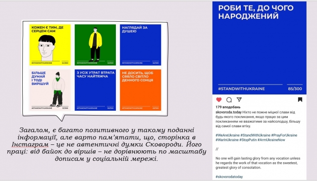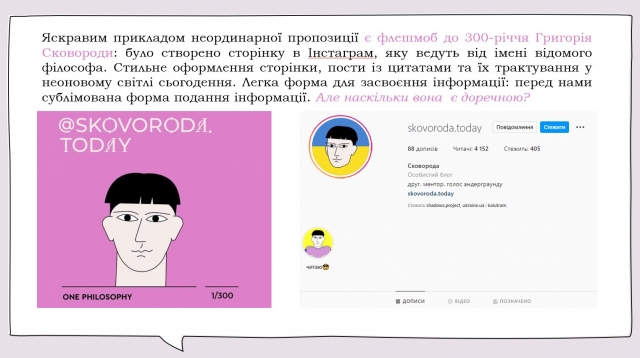 «Інженерія свідомості сучасного українця. Григорій Сковорода як важлива постать у її формуванні» (ВОЄВОДСЬКА Калерія та Наталя КАЛЬКА, ФЗРБЕ, БТ). У своїй доповіді дівчатка акцентували увагу на тому, як розповісти молодому поколінню про славне минуле так, щоб це не мало прісного смаку та затхлого запаху наративу шкільного бубоніння «це обов’язковий факт, який кожен учень повинен зарубати собі на носі!». Яскравим прикладом неординарної пропозиції є флешмоб до 300-річчя Григорія Сковороди: було створено сторінку в Інстаграм (https://www.instagram.com/skovoroda.today/), яку ведуть від імені відомого філософа. Стильне оформлення сторінки, пости із цитатами та їх трактування у неоновому світлі сьогодення. Легка форма для засвоєння інформації: перед нами сублімована форма подання інформації.
