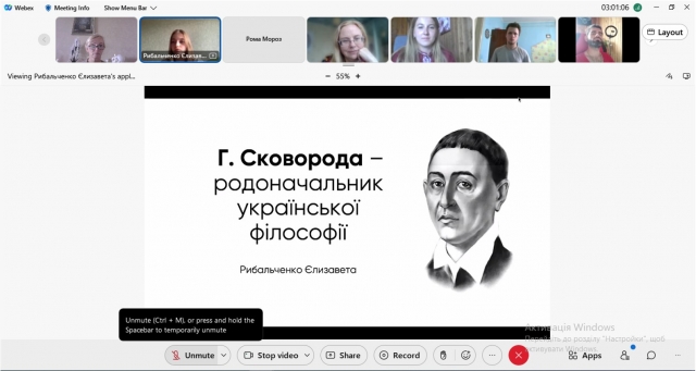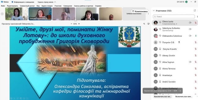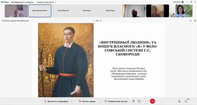 Наукову роботу семінару розпочали аспіранти кафедри філософії та міжнародної комунікації: Олександра Соколова, яка розкрила актуальність ідей видатного українського філософа, зокрема охарактеризувала школу духовного пробудження Григорія Сковороди.