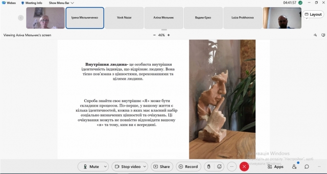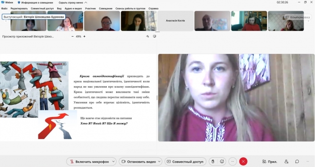 Аспірантка Вікторія Шеховцова-Бурянова зацікавила присутніх актуальністю проблематики самоідентифікації як чинника саморозвитку особистості та пошуків національної ідентичності.
