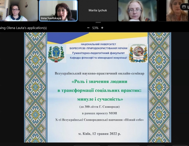 12 травня 2022 року на гуманітарно-педагогічному факультеті відбулися ювілейні Х-ті Сковородинські навчання. Кафедрою філософії та міжнародної комунікації організований та проведений науково-практичний онлайн семінар «Роль і значення людини в трансформації соціальних практик: минуле і сучасність». Цього разу участь в навчаннях «Пізнай себе» взяли понад 140 студентів та аспірантів з різних факультетів НУБіП України.