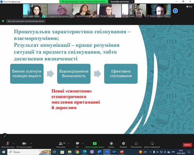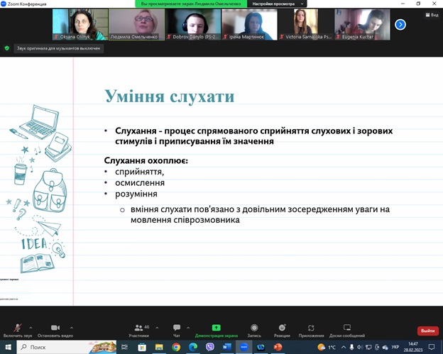 В останній день зими, 28 лютого 2023 року, відбулася відкрита лекція в дистанційному форматі кандидата педагогічних наук, доцента кафедри психології Людмили Омельченко з навчальної дисципліни «Психологія спілкування» для студентів другого курсу спеціальності 053 «Психологія» гуманітарно-педагогічного факультету. На лекції, окрім здобувачів, були присутні завідувач та викладачі кафедри психології, представники адміністрації гуманітарно-педагогічного факультету.