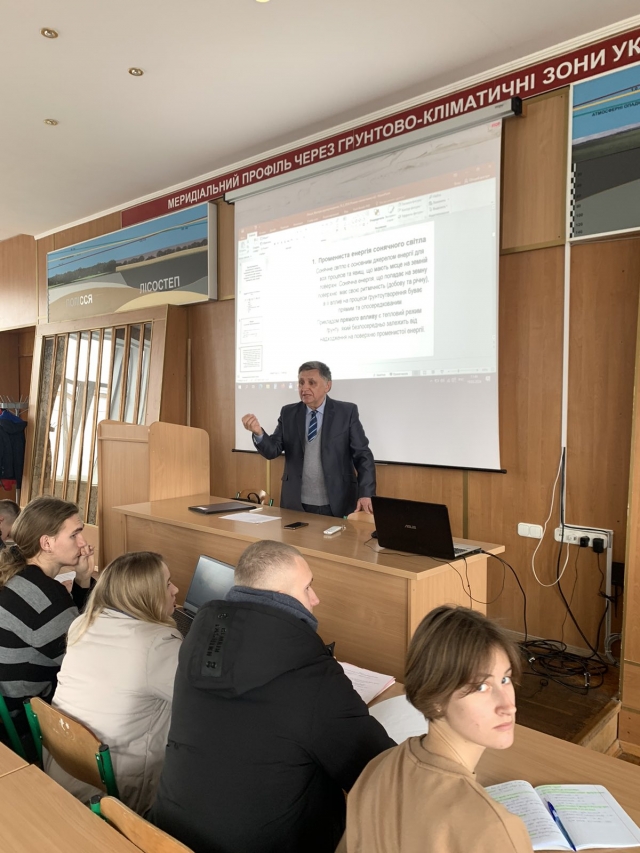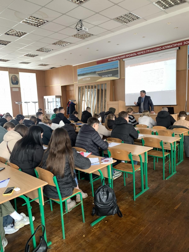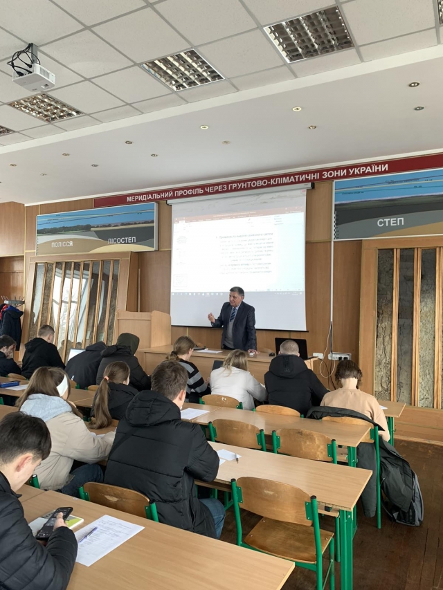 В спеціалізованій лекційній аудиторії №53 (Музеї ґрунтів НУБіП України), обладнаній мультимедійними засобами й наочними натурними зразками профілів різних типів ґрунтів з усього світу, студенти ознайомились з чинниками, які необхідні для формування ґрунту як природно-історичного тіла і основного засобу виробництва продукції рослинництва.