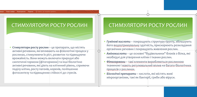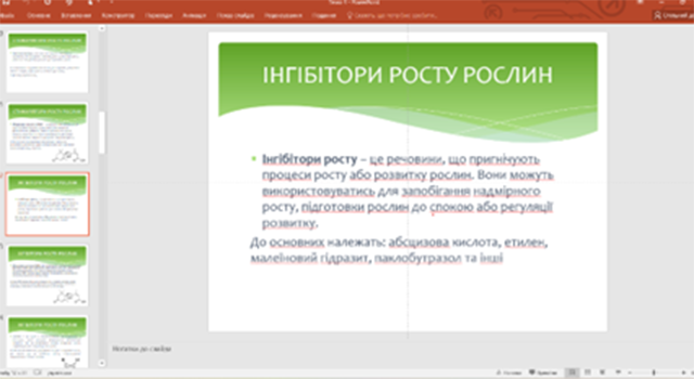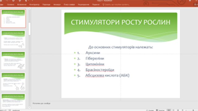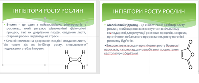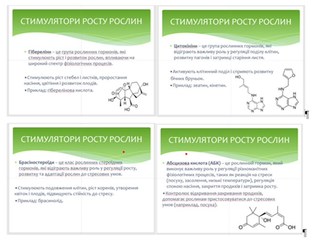 Також було дано характеристику основних стимуляторів росту, їх основні функції, приклади речовин, господарське значення та застосування.