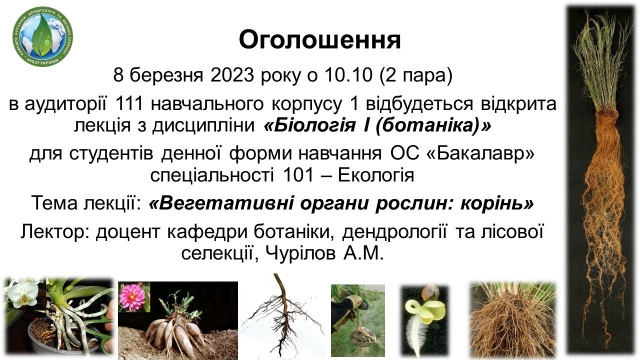 8 березня 2023 року о 10.10 (2 пара) в аудиторії 111 навчального корпусу 1 відбудеться відкрита лекція з дисципліни «Біологія І (ботаніка)» для студентів денної форми навчання ОС «Бакалавр» спеціальності 101 - Екологія