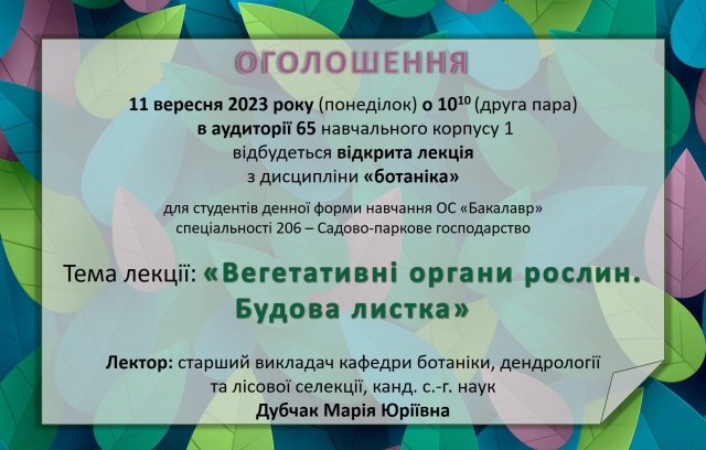 11 вересня 2023 року (понеділок) о 1010 (друга пара) в аудиторії 65 навчального корпусу 1 відбудеться відкрита лекція з дисципліни «Ботаніка» для студентів денної форми навчання ОС «Бакалавр» спеціальності 206 Садово-паркове господарство.